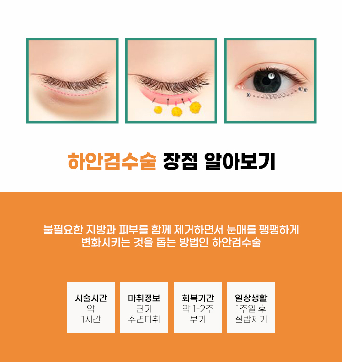 이런 상태에서 강남 하안검수술 추천 정보 알아보는 분도 늘어나는 것 같습니다. 중년을 위한 눈성형 수술 중에 손꼽히는 하안검 수술 같은 경우, 불필요하게 늘어진 피부, 조직, 지방 등을 절개하고 절제하며 봉합하는 수술이라고 합니다. 수술의 세부적인 과정, 붓기, 회복 기간 등은 강남 하안검수술 추천 정보 알아보고 수술을 진행하는 개인에 따라서 차이가 있을 수 있습니다.